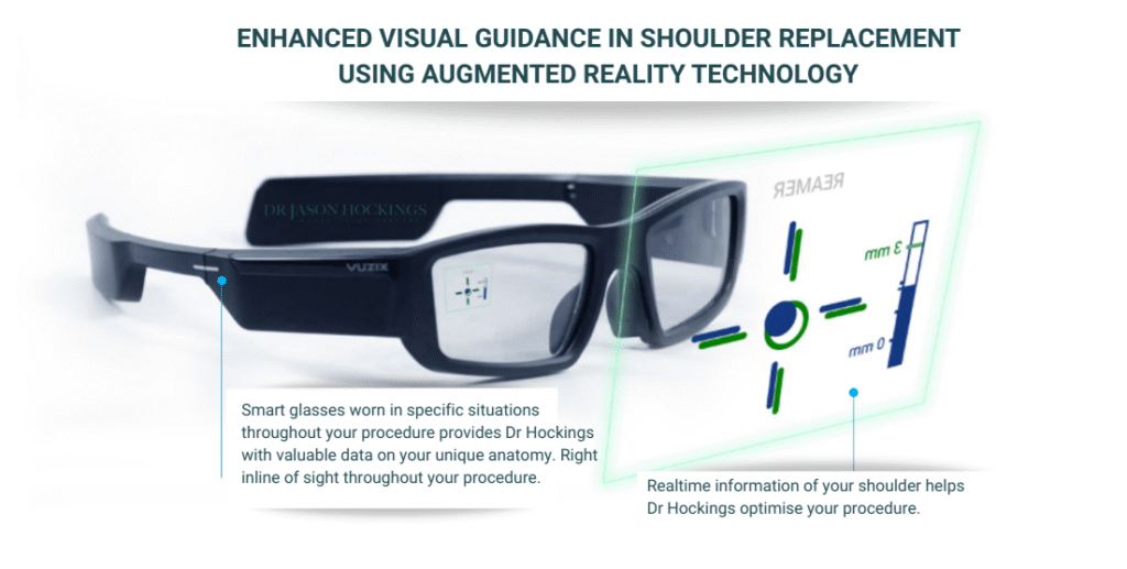 Dr Hockings performs reverse shoulder procedures using either a deltopectoral or superior approach, depending on your anatomy and clinical needs. During surgery, he also incorporates an augmented reality surgical platform called NextAR that uses smart glasses to provide live visual feedback based on your personalised anatomical plan.